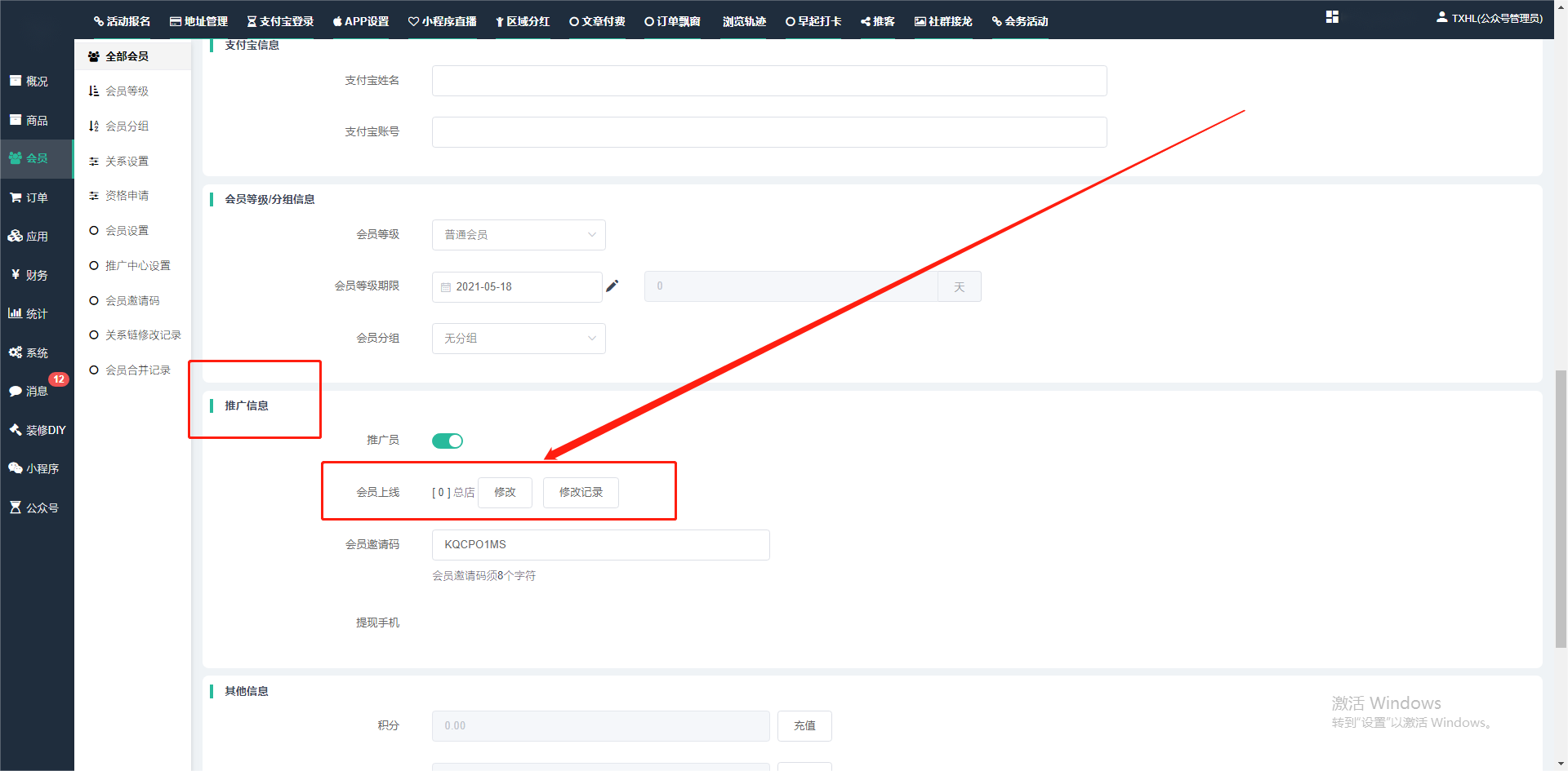 目录 搜索 展开 一、前期准备资料二、数字乡村码-上线操作指南1、服务号的申请流程及认证2、申请小程序流程3、开放平台绑定小程序和公众号三、数字乡村码-系统操作数字乡村码系统管理-概况数字乡村码-商品管理1、发布商品2、商品列表3、商品表单4、商品分类5、品牌管理6、配送模板7、评论管理8、优惠券管理9、商品标签10、退货地址设置11、满额优惠12、批量操作13、配送方式14、基础设置15、商品隐藏四、数字乡村码-会员管理1、全部会员2、会员等级3、会员分组4、资格申请5、会员设置6、推广中心设置7、会员邀请码8、会员关系链修改关系链修改记录9、会员合并记录10、账号注销管理11、会员设置中心五、数字乡村码-订单管理1、订单管理列表2、订单处理流程3、订单状态4、订单修改价格5、订单退款退货6、多包裹发货7、批量发货订单操作步骤8、催发货订单9、物流查询六、数字乡村码-财务管理1、余额设置2、会员余额3、充值记录4、转让记录5、余额明细6、收入明细7、提现设置8、提现统计9、积分管理10、转账审核11、收益广告12、批量充值七、数字乡村码-系统管理1、商城入口2、商城设置①、商城设置②、订单设置③、物流查询④、短信⑤、联系方式⑥、分类⑦、优惠券⑧、分享⑨、幻灯片⑩、广告位⑫、地图设置3、交易设置4、微信模板消息自定义消息模板(新版)自定义消息模板(旧版)小程序消息模板公众号模板消息变更公告5、语言设置6、权限管理7、多媒体管理八、数字乡村码-消息管理九、数字乡村码-应用管理十、数字乡村码系统-数据统计十一、数字乡村码-页面装修DIY1、模板管理2、店铺页面3、顶部导航4、底部导航5、DIY模板市场6、首屏广告7、基础设置8、装修DIY尺寸建议十二、供应商功能插件操作指南1、供应商2、门店-收银台门店申请和使用步骤门店管理①、门店-收银台 营销设置②、门店-收银台 分润设置门店分类门店申请门店审核门店商品门店商品订单收银台订单数据统计核销员基础设置默认设置门店装修3、微社区4、会务活动十三、营销插件操作指南活动报名提货卡新人奖微店问卷调查积分视频分享1、视频分享基础设置2、视频分享发现管理3、视频分享分类管理4、视频分享评论管理5、视频分享分红记录6、视频分享短视频中心每日红包幸运大抽奖签到优惠券二维码任务奖励优惠劵文章音频文章付费文章限时购新海报拓客卡操作流程积分活动素材中心视频红包十四、入驻门店应用类1、门店预约2、附近商品3、门店定位设置4、门店控制5、门店满额包邮6、门店满额减7、导入商品8、门店搜索9、门店股东10、核销券11、多门店核销1、商城后台设置2、前端功能演示十五、常见问题1、后台登录密码修改流程2、会员-余额,积分,后台如何进行充值与扣除3、如何修改上下级关系4、一种万能的获取商城小程序路径的方法 暂无相关搜索结果! 阅读次数:1830 本文档使用 模王系统 发布 3、如何修改上下级关系 如何修改上下级关系一.如何修改上下级关系?1.会员-全部会员-可以通过搜索用户的独立ID,或者用户微信昵称,找到此会员,然后点击右边的(操作)2.再点击会员详情。3.滑到下面,有个推广信息-会员上线,点击修改4.输入上级的ID号,点击搜索,出来此上级会员后点击选择。5.滑到最下面,一定要点击提交按钮。文档更新时间: 2024-01-05 14:50 作者:链上旅行