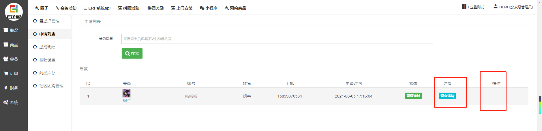 显示自提点申请会员信息,可进行审核驳回的等操作